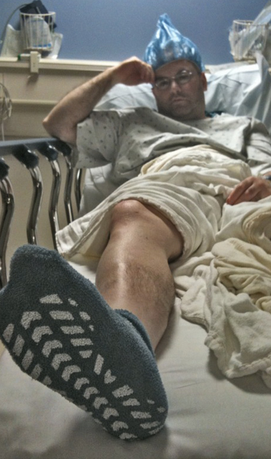 This is me, pre-op, shaved leg, cute blue footies and conehead-styled hair net (courtesy of Karen).